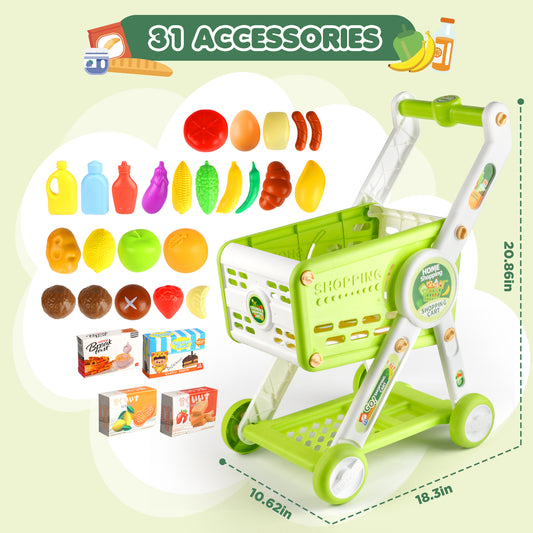 UUSUOO 31Pcs Shopping Cart for Kids,Pretend Play Toys with Play Food and Shop Accessories,Grocery Shopping Cart for Kids, Christmas Birthday Gift for Kids Age 3-8