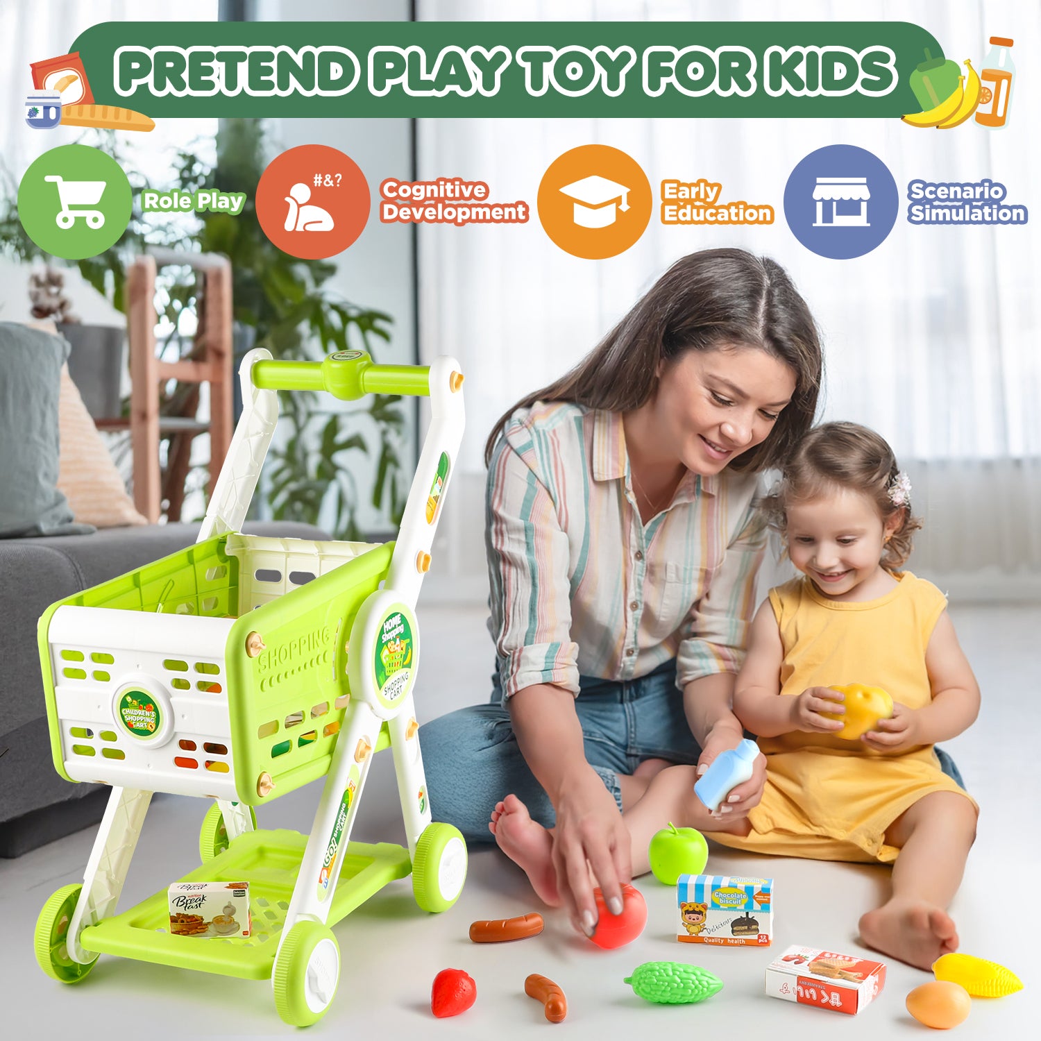- π FUN PLAY SHOPPING CART SET - Kids shopping cart toy with food simulate the process of supermarket shopping, allowing children to take on the role of a shopper and satisfy the shopping experience. Kids can use their imagination to create richer and more diverse shop simulation scenarios.