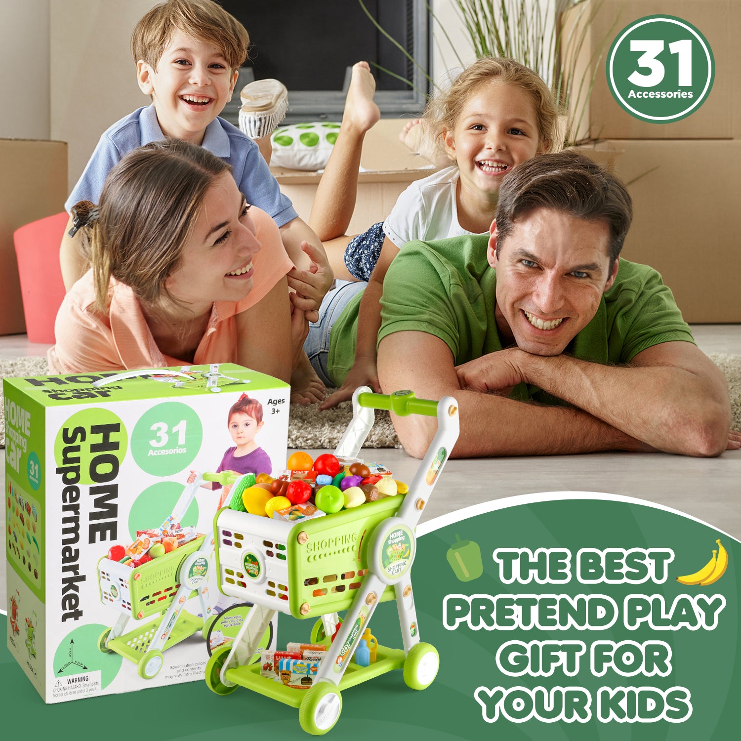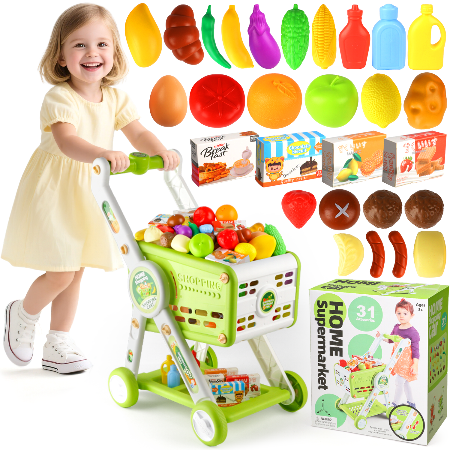 - π EDUCATIONAL TOY GIFT - Our kids shopping cart for boys girls has bright colors and a variety of play foods, which can help children recognize different vegetables and fruits, cultivate their ability to buy and pay independently.Itβs a great toy for 3+ kids on birthdays, Christmas, and more.