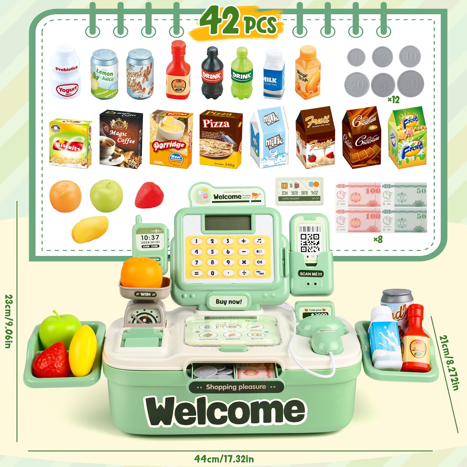 Our kids cash register comes with a total of 42 accessories, including 1 cash register toy, 21 pieces of play money and credit cards, and 20 pieces of play food such as drinks and fruits. This toy cash register provides a full pretend play experience for young grocery store play set enthusiasts. Ideal for kids ages 3-8, it helps engage their imagination and role-playing skills, making it the perfect gift for birthdays, Christmas, or any special occasion.