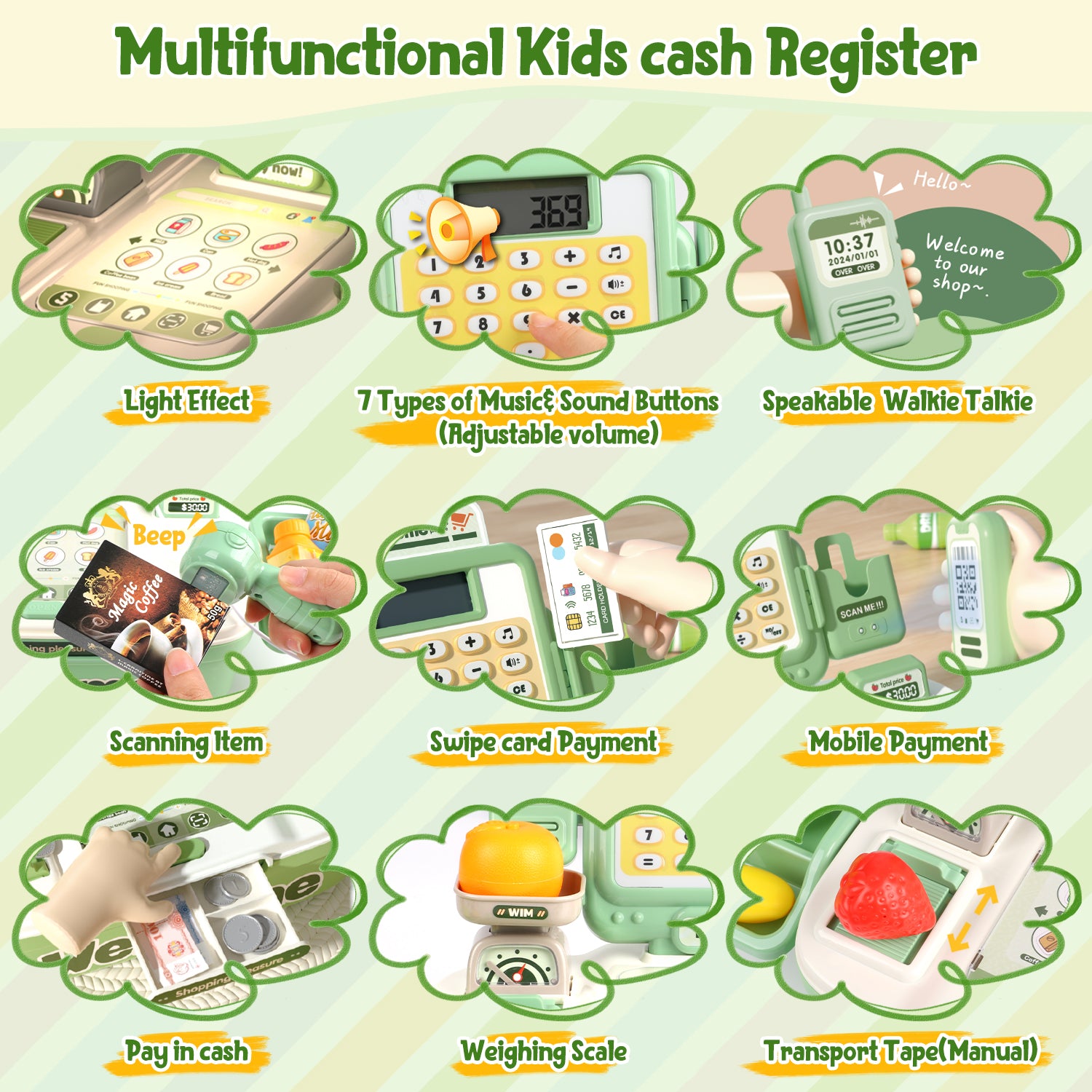 UUSUOO Cash Register for Kids Ages 4-8, Cashier Register Toy, Kids Pretend Play Cash Register Toys with Sound Scanner,Credit Cards,Play Food & Money,Christmas Toys for Kids 3-6,Green