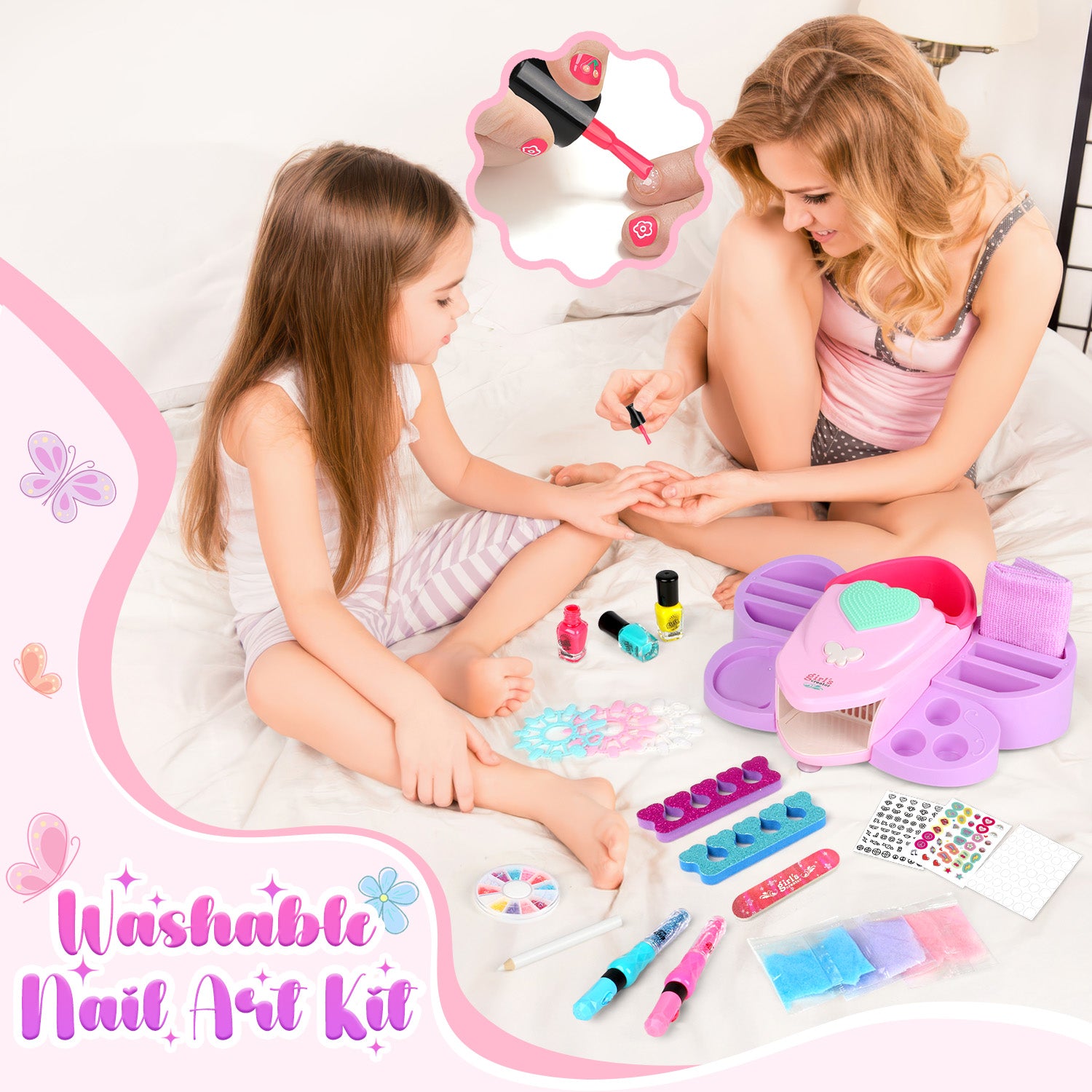 - 🌈 GIRLS NAIL KIT WITH EVERYTHING - The integrated nail machine, shaped like a butterfly, features a storage rack, nail fan dryer, and hand care. In addition, our nail art kits for girls includes peelable nail polish,3-in -1 nail pen, glitter powder, file and everything primary stuff to be a nail designer. Your girls can't wait to share and create bling and glamour nail looks with friends in any occasion. A complete nail kit for girls ages 7-12.