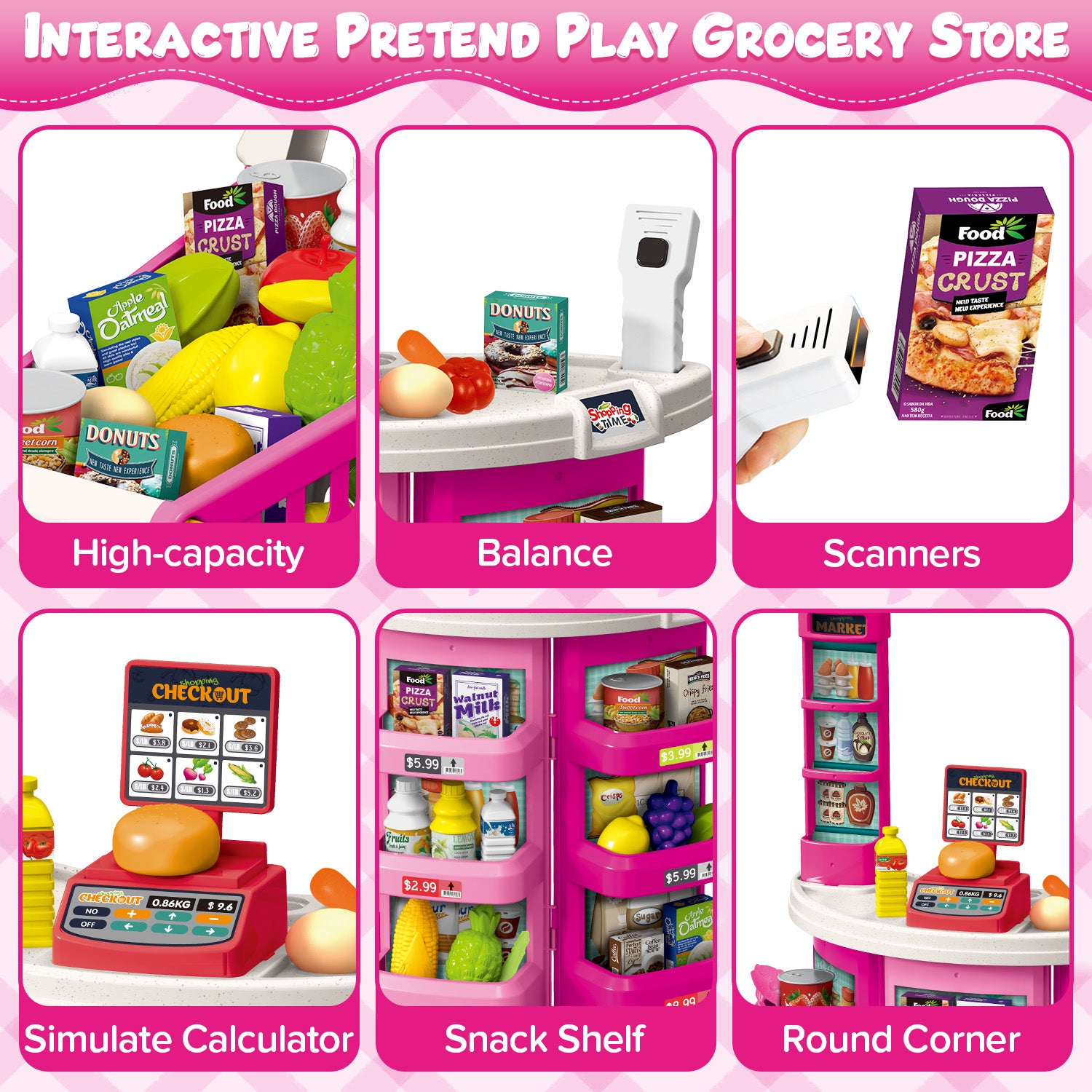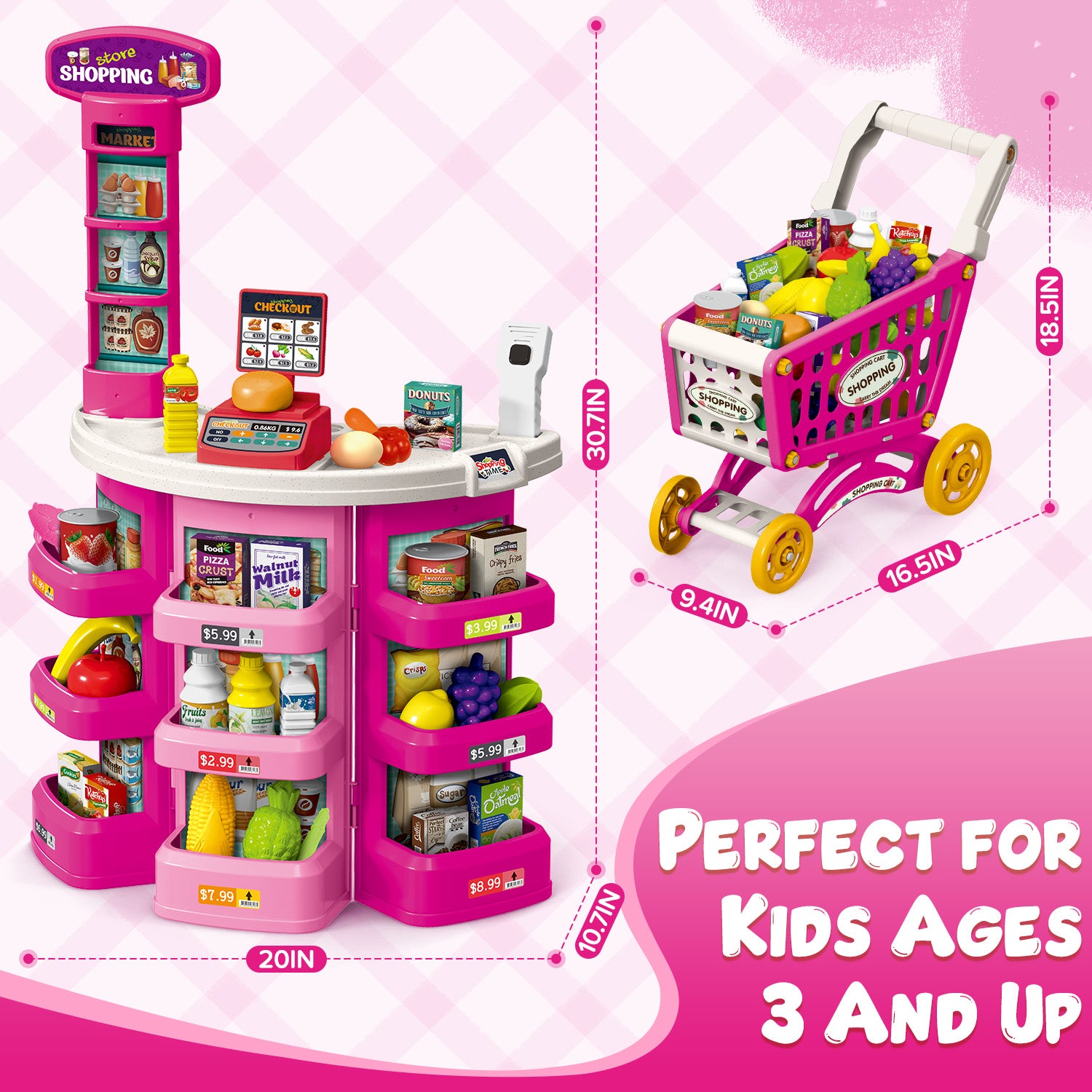 - 🎁 【PERFECT GIFT IDEA FOR BOYS & GIRLS】Made for kids ages 3 and up, the supermarket playset for kids with shopping cart will make an excellent gift for special occasions like birthdays and Christmas. From the assorted food items, working scanner, and kids shopping cart, any child will be delighted to have this supermarket playset.