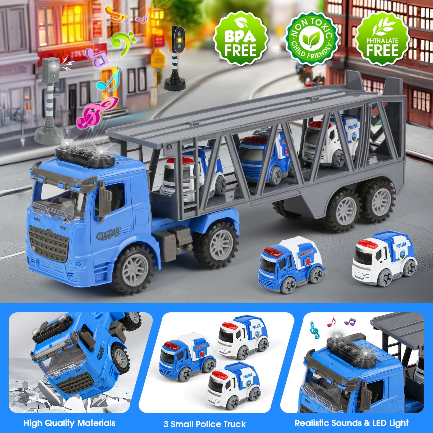 - šØ 4 IN 1 TOW TRUCK TOY - UUSUOO Police car toys for boys 3-6 years with lights and sound includes a large transport truck,3 small police truck and 2 light & sound sign. Each diecast police car is in distinctive design and perfectly fit in kids' hands and pockets. With anywhere, your child can create their own police rescue base.