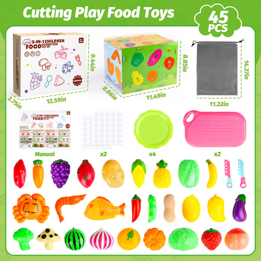 UUSUOO 3-in-1 Cutting Play Food Set,Pretend Play Kitchen Playset with Fake Food for Kids Toddlers,Pretend Food Toys,Play Kitchen Toys Accessories,Best Cooking Toys Christmas Gifts for Kids 3-6
