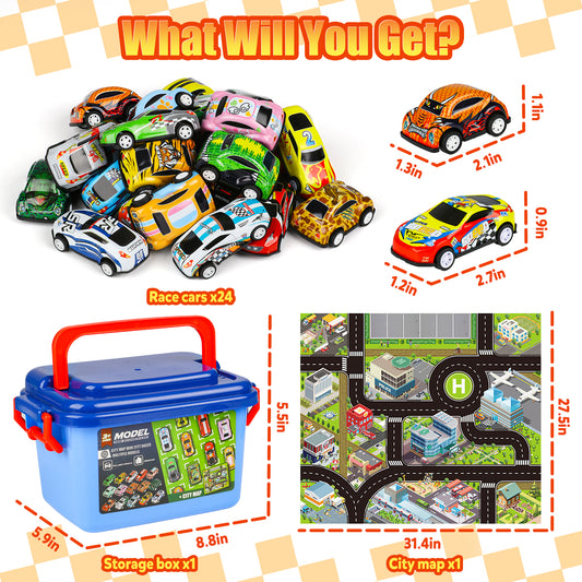 UUSUOO 24 PCS Pull Back Cars with Storage Box,Toy Race Cars for Toddlers,Party Favors, Mini Die-Cast Race Cars Vehicles Bulk Toys for Boys Girls Toddlers,Christmas Toys for Toddler Boys 1-3