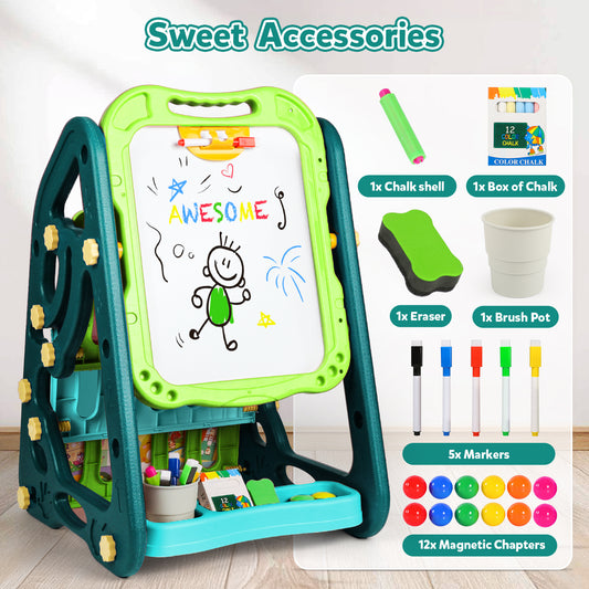 UUSUOO 3 in 1 Easel for Toddlers 3-6,Double Sided Kids Art Easel with Magnetic White Board & Chalk Board,Adjustable Standing Toddler Easel with Art Accessories,Christmas Gift for Kids Ages 3+,Green