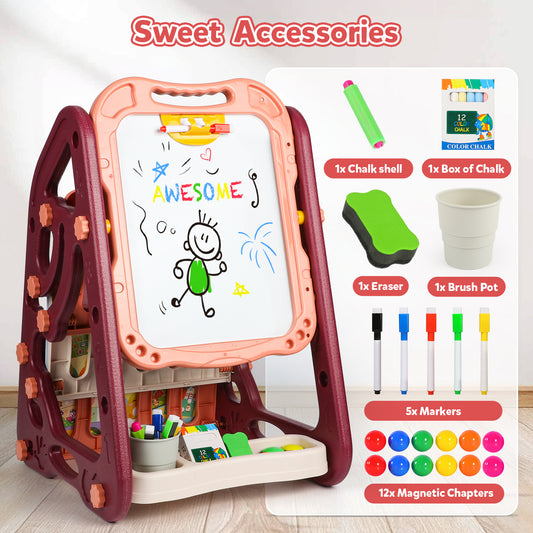 UUSUOO 3 in 1 Art Easel for Toddlers,Double Sided Kids Art Easel with Magnetic White Board & Chalk Board,Adjustable Standing Toddler Easel with Art Accessories,Christmas Gift for Kids Ages 3+,Red