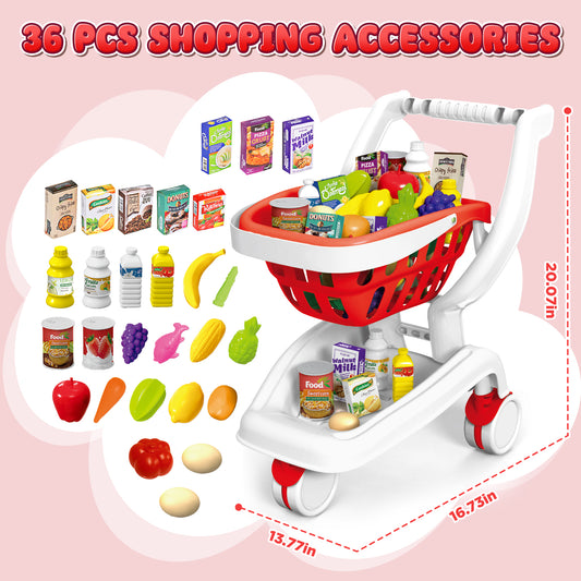 UUSUOO 36Pcs Shopping Cart for Kids,Toy Shopping Cart with Play Food Fruit Vegetable and Shop Accessories,Pretend Play Grocery Store Toys for Toddlers Age 3-6 ,Red